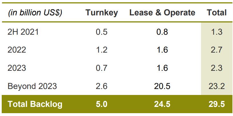 - The FPSO Liza Unity and Prosperity contracts cover a maximum period of two years of lease and operate within which period the units will be purchased by the client. The impact of the sale is reflected in the Turnkey backlog, assumed at the end of the contractual lease and operate period.