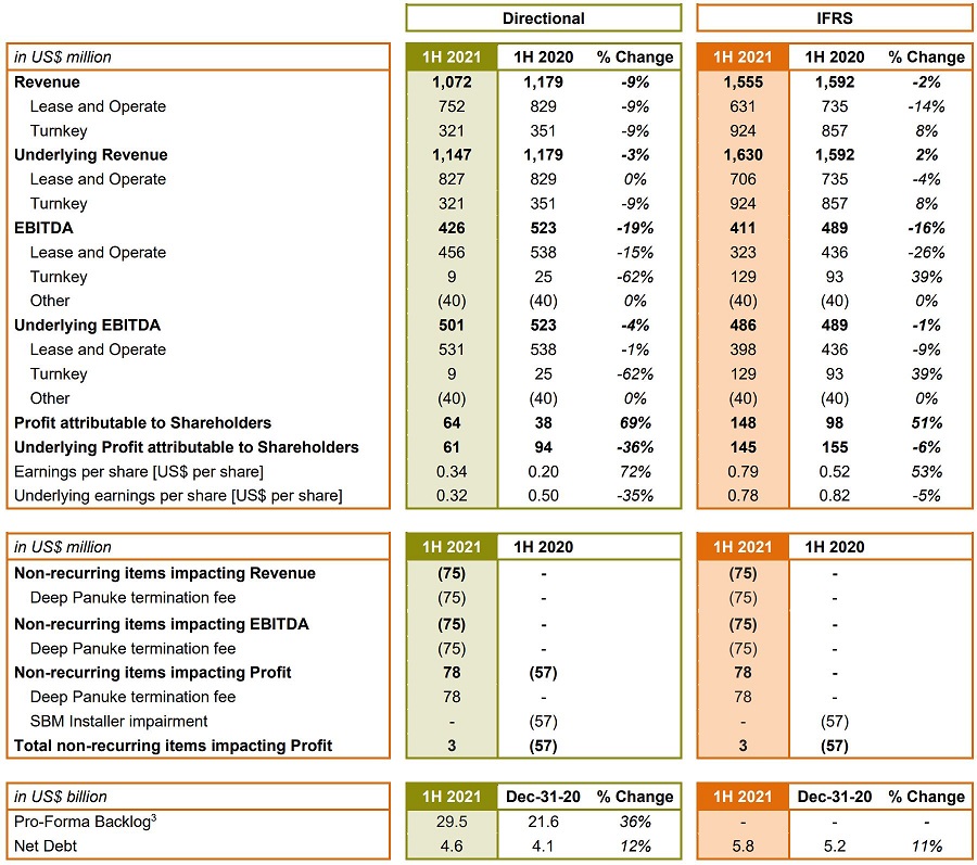 Underlying Directional Revenue and EBITDA includes US$75 million related to final cash received during the period under the final settlement signed with the client following the redelivery of the Deep Panuke MOPU in July 2020. These expected cash receipts in 2021 were excluded from the Underlying 2020 Revenue and EBITDA as reported in the 2020 Annual Report. Considering the associated depreciation of the vessel, this non-recurring item only negligibly impacted the Underlying profit attributable to shareholders.