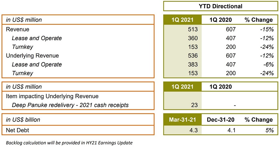 The Company’s 2021 Directional revenue guidance is maintained at around US$2.6 billion, of which around US$1.6 billion is expected from the Lease and Operate segment and around US$1 billion from the Turnkey segment. 2021 Directional EBITDA guidance is maintained at around US$900 million for the Company.