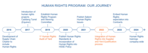 Human rights have been a key focus for SBM Offshore and have been part of the Code of Conduct since 2012. SBM Offshore has communicated commitments and values to suppliers through the Supply Chain Charter since its inception in 2017. A significant advancement in integrating human rights into SBM Offshore’s operations occurred in 2020 with the inclusion of human rights in SBM Offshore’s HSSE Policy and the establishment of the Human Rights Standards directive. Since then, SBM Offshore has enhanced its due diligence processes for both suppliers and its own operations, improving the qualification process and conducting Human Rights Impact Assessments. SBM Offshore will continue to communicate human rights requirements to clients and suppliers, to continue reducing adverse impacts, promote positive impacts and manage material risks and opportunities.