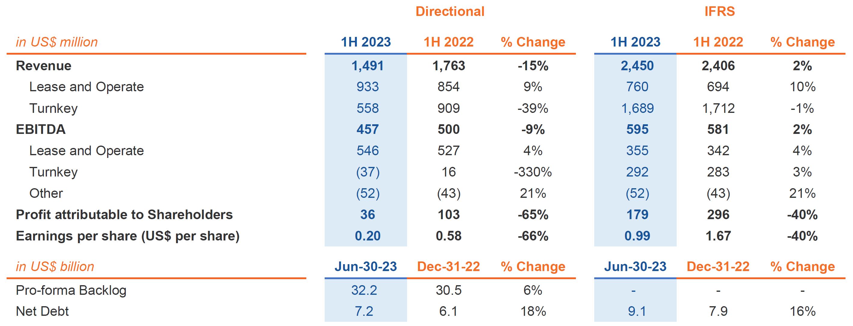 Directional net profit stood at US$36 million for first half-year of 2023, down from US$103 million in the year-ago period. The decrease reflects the same drivers as for Directional Turnkey EBTIDA and Other non-allocated costs charged to Directional EBITDA.