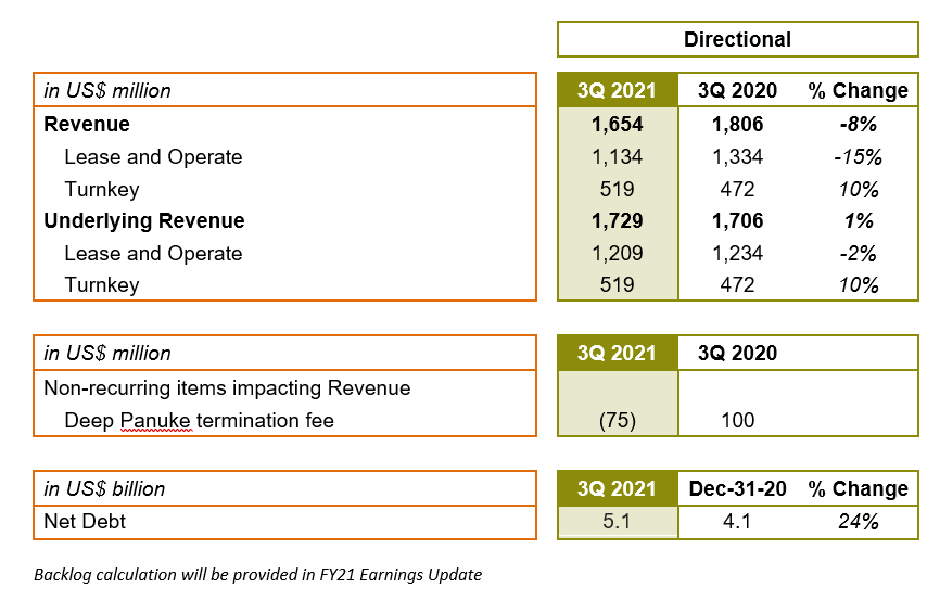Year to date, Underlying Directional revenues came in at US$1,729 million compared with US$1,706 million in the same period of 2020. Turnkey revenues increased by 10% or US$47 million compared with the same period last year reflecting the higher level of activity. Lease and Operate was nearly constant with a decrease of 2% or US$25 million compared with the same period last year.